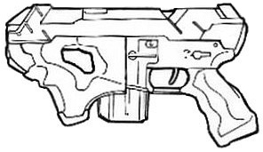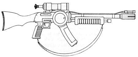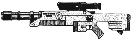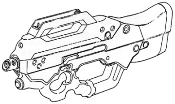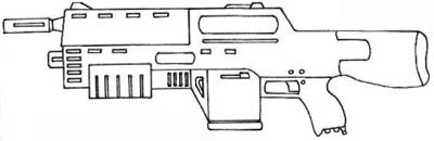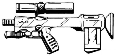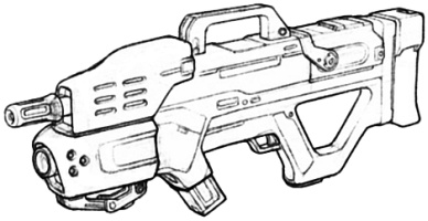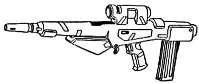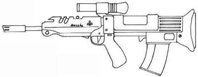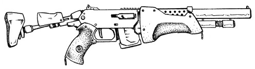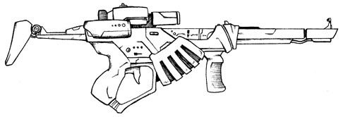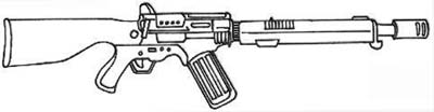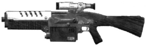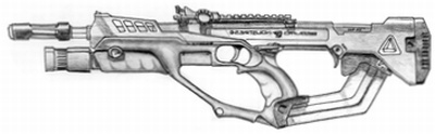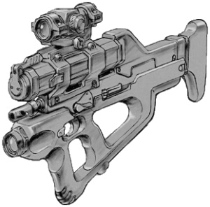 | The CAW2000, built for CyberTronic by Cybersecurity Inc., is a close assault rifle with integral grenade launcher. The only drawback to this weapon design is that the grenade launcher cannot be used when the bayonet (normally hidden inside the stock) is attached to the barrel. |
