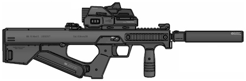 | US Army's command, the M22 is an extremely short assault rifle intended for vehicles crews. It's equiped with an integrated laser sight, tactical light, aimpoint and silencer. |