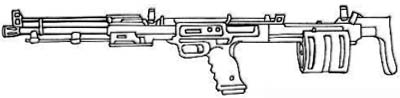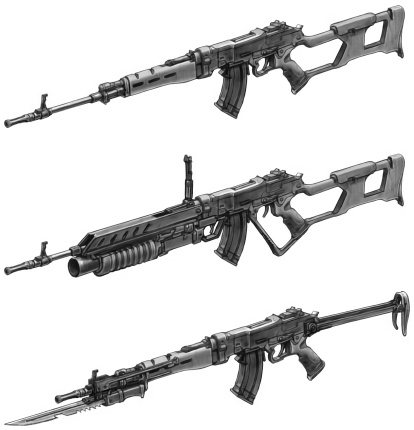 | Another Russian equivalent of the Heckler and Koch M-52AR and the Arasaka Morita. A rather unique innovation is the fact that the assault rifles magazine loads into the rear of the stock. It also features a magazine fed 6 shot 25 mm grenade launcher. |