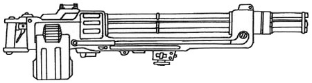 | This European heavy assault cannon is a scaled down version of the same sort of cannon usually mounted to the nose of helicopters. Yet it is fully man portable, and fireable. Accuracy drops by 3 if not using a gyrostabilizer mount or tripod however. |