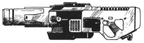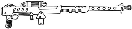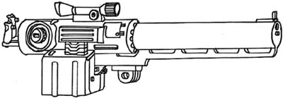 | Do you really need to lay down a field of fire that will absolutely destroy anything in its path, then you need the HMG 9000. This electrically fired heavy machine gun is man portable but only by a full borg, and with the aid of a gyro stabilizer you can even fire it on the run. For more accurate fire you can mount it on a vehicle or tripod. It accepts belt fed ammunition only and for an extra 200 eb you can get it smartchipped. -3 to accuracy if firing the weapon without gyro stabilizer or tripod. |