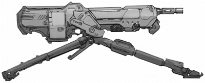| This extremely impressive anti-tank gun fires the enormous 20 mm round at an incredible 2400 rounds per minute. It must be mounted on a tripod, gyrostabilizer, or vehicle to be fired. Smartchipping is available. Very common sight on EDF vehicles. |