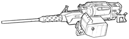 | This six-barreled gatling machinegun is marketed as "the firepower of a jet fighter in the hand of mechanized infantry". Well, sort of ! It fires a subcaliber, discarding sabot round less powerful than a true 20 mm shell. It is still mostly a vehicular weapon because of it's weight (50 kg, unloaded, and 20 kg for a 100-round belt). In game terms, you need top of the line linear frame or an ACPA to fire this thing without a mount. |