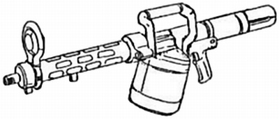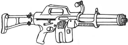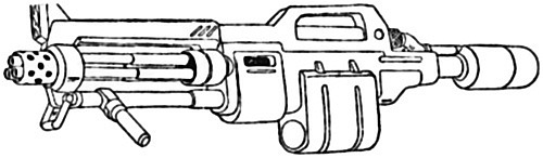 | Short ranged weapon with a pretty good rate of fire. An electric engine allows the four barrels to rotate before starting to fire. A round of "heating" is necessary before the barrel can rotate fast enough to reach the entire rate of fire for the weapon. If the gunner shoots immediately, apply half the rate of fire during the first round (20). There is no need to mention that one must be well muscled to hold the M70 minigun efficiently while it is being fired. |