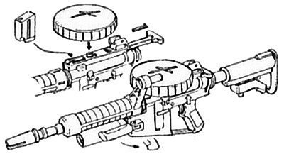 | A very simple MG, with a huge drum magazine. For less snag, and ease of carrying the shoulder stock unfolds. |