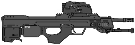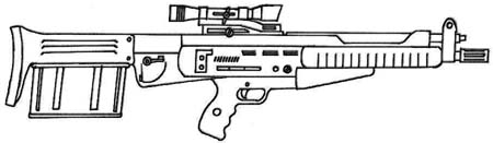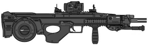 | US Army's command, this machine gun is derived from the assault rifle Cyberdyn M3. It's equiped with integrated laser sight and a scope. |