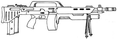 | A chinese military machinegun, the folding foregrip is a nice touch. Able to accept an 80 round magazine or belt fed ammunition. |
