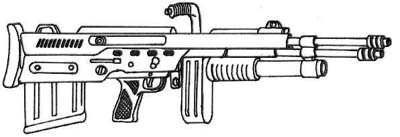 | This support infantry weapon which appeared during the wars in South America. It's a light machinegun with two barrels and with a 40 mm long range grenade launcher. It doesn't have any overheating problem, due to its double explosion chamber system. Only its weight (over 10 kilos loaded) can disturb an infantryman. It is easier to use on a tripod or a vehicule. Grenade launcher : 0 7 1 40 mm VR 200 m. |
