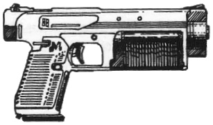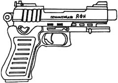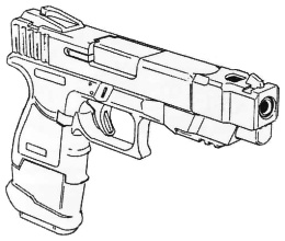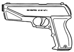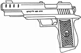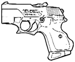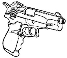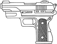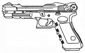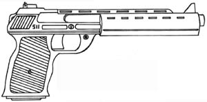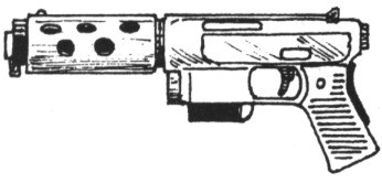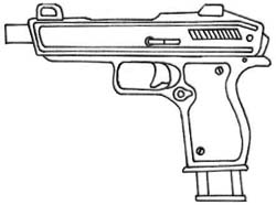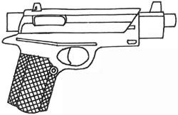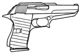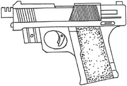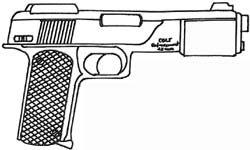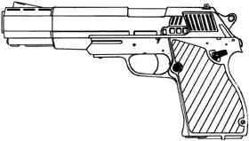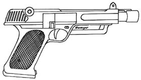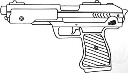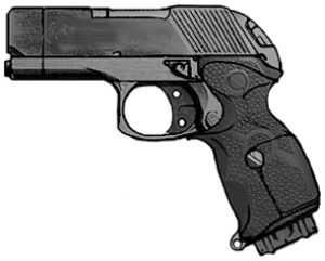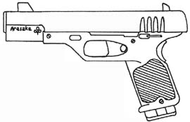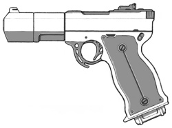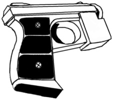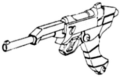 | An inexpensive pistol, reminiscent of the Luger. It looks a bit odd, but has found a following with many of the youth gangs, especially since it comes standard in gold and chrome. |