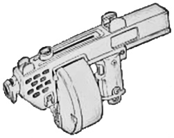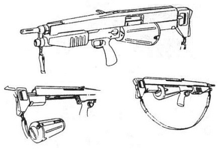 | The SH-8 is a helical drum fed 12 ga shotgun that features a hinged front handle allowing it to either extend downward or to the side. |