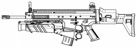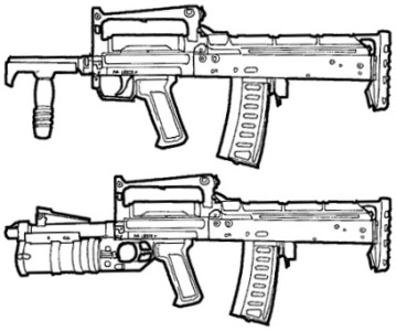 | A firing selector allows to choice to fire with the assault rifle or the 40 mm grenade-launcher (accuracy : 0, magazine : 1, rate of fire : 1, range : 150 meters). This version is less accuracy (accuracy : 0) because of the disappearance of the handle that allows better stabilize the weapon. A conversion kit lets you go on with one another. |