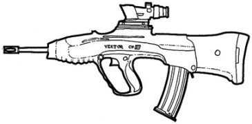 | The CR-21 is housed in an ergonomic plastic shell and arranged in a bullpup configuration. The center of gravity for the weapon is over the pistol grip, making the weapon usable accuratly with one hand. The gun can mount scopes, illuminators and other accessories. |