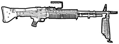 | Mechanically the MAG is a very simple weapon. The action is gas-powered and uses a tipping breechblock. The bipod can be folded to form a simple forward handgrip, the barrel can be removed and replaced quickly, and the stock can be either plaztic or wooden. The gun itself may be mounted on a bipod, tripod, or a pinle mount. |