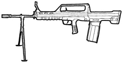 | This gun is the LMG variant of the QBZ family of weapons. Its bullpup design give it superior accuracy and range over similar LMGs. It features a heavier barrel and a folding bipod both designed for sustained automatic fire. There is no option for a belt-fed mechanism, however. Also accepts standard QBZ magazines. |