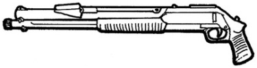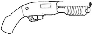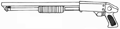 | A not so successful attempt to make the Mossberg 500 into a more effective combat weapon. While allowing the shotgun to retain a full length barrel while being as short as legally possible it has trouble with the extended action and trigger mechanism. |