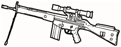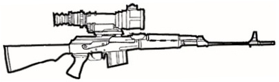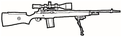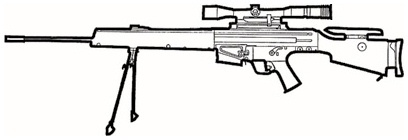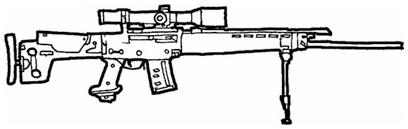 | The Sniper is an even more heavily modified Galil AR rifle. It features a heavier barrel, a bipod that attaches to the front end of the receiver, and a wooden shoulder stock with adjustable cheekpeice that folds forward for compact storage of the weapon. There are many scopes available for the Sniper, including standard, night vision, and infared. Also available is a screw-on surpressor. |