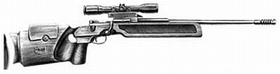 | This rifle uses the familiar Mauser action chambered to fire the 7.62 NATO cartridge. It features a heavy barrel and a ambidexterous wodden thumbhole grip. The forestock contains a harmonic balancer that dampens the barrels vibration when fired. |