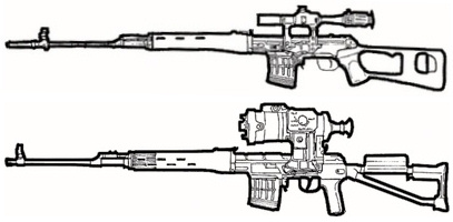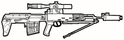 | Unlike other russian sniper designs, the SV-98 was designed for long range sniping. Its stock is available in either wood or composite materials and is fully adjustable. Two vents help cool the barrel. A bipod can be fitted and the barrel is free-floating, improving accuracy. |