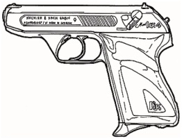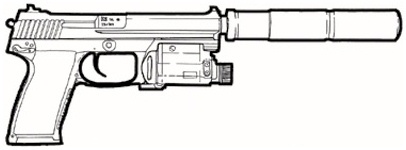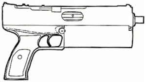 | Silent pistol designed for paramilitary operations, uses silent-piston driven sealed cartridges. Good for silent operations, such as hostage rescue, but unsuited for assasination because of easily identifiable round and the fact that it ejects its shell casings. Easily concelable though. |