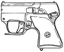 | The Type 77 is a smallish design for conceled carry or convience. It uses a blowback action where the triger guard itself is used to cock the weapon. The finger is hooked armound the outside of the trigger guard and pulled towards the trigger to cycle the action and ready the next round. This allows it to be carried with an empty chamber for safety, but can be rapidly drawn and cocked with one hand, with the hand already in firing position. |