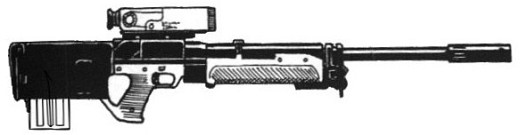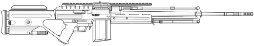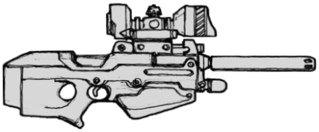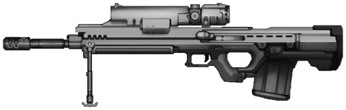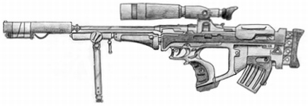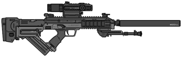 | A very odd, but finely tuned instrument from Kendachi. At first glance one will notice the odd magazine placement and feed design of the weapon, but don't let it fool you. Created primarily as a sniper weapon, a job at which it good at, the weapon is also fully capable of acting as an assault rifle. The barrel is shrouded and insulated, and acts as an effective suppressor. |